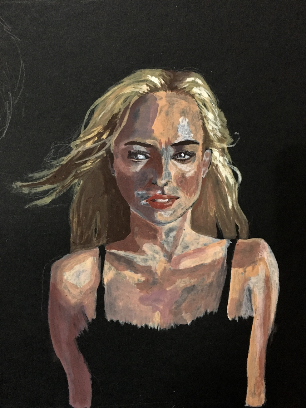 I was inspired by a scene in "A Bigger Splash" by Luca Guadagnino where Dakota Johnson was being a tease to Matthias Schoenaerts. She looked so coy and beautiful--I just had to paint her.